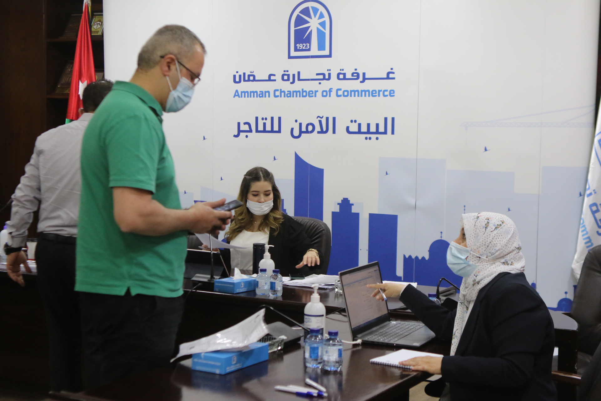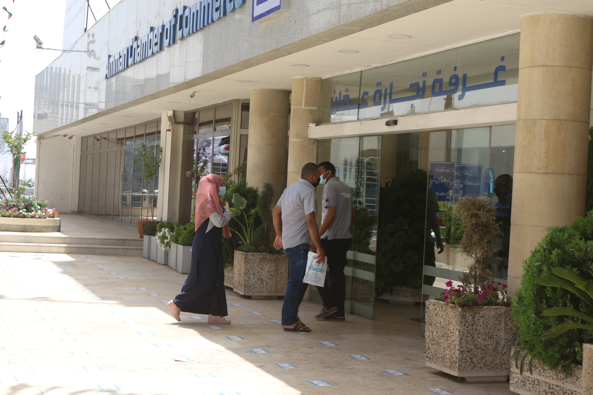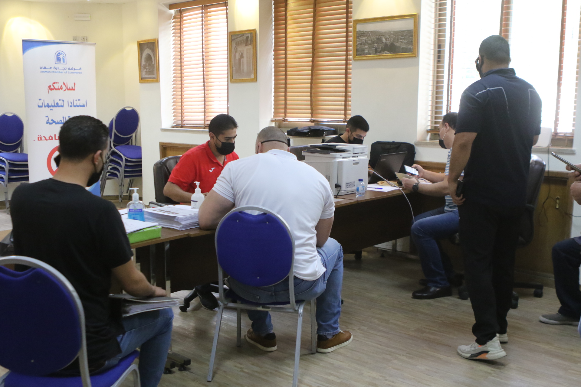 بدأت غرفة تجارة عمّان، استقبال منتسبيها في العاصمة عمّان من أصحاب الشركات والمؤسسات التجارية وموظفيهم والعاملين لديهم، الراغبين بالعودة للعمل لتقديم طلب للجهة المسؤولة والتوقيع على تعهد خاص بالالتزام بالبروتوكولات الصحية. (صلاح ملكاوي/المملكة)